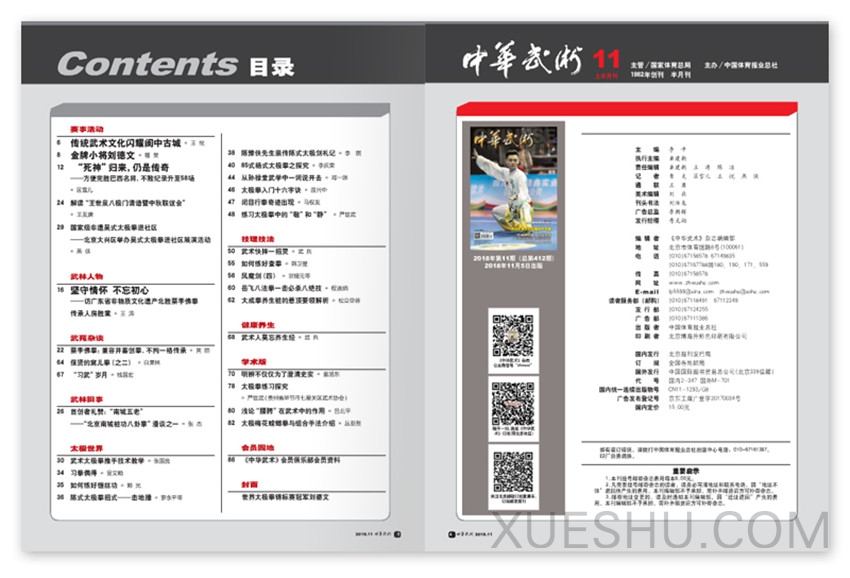 在世纪之交,该刊向读者奉献的新千年礼物――大型彩色经典挂图和4开彩色《中华武术特刊》专版深受广大读者欢迎,《中华武术》(月刊)经过多年的不懈努力,流行度高,大众辨识度广,创刊于1982年,开拓了视野,带给读者富有生活特色的内容,力求引导武术新潮流。